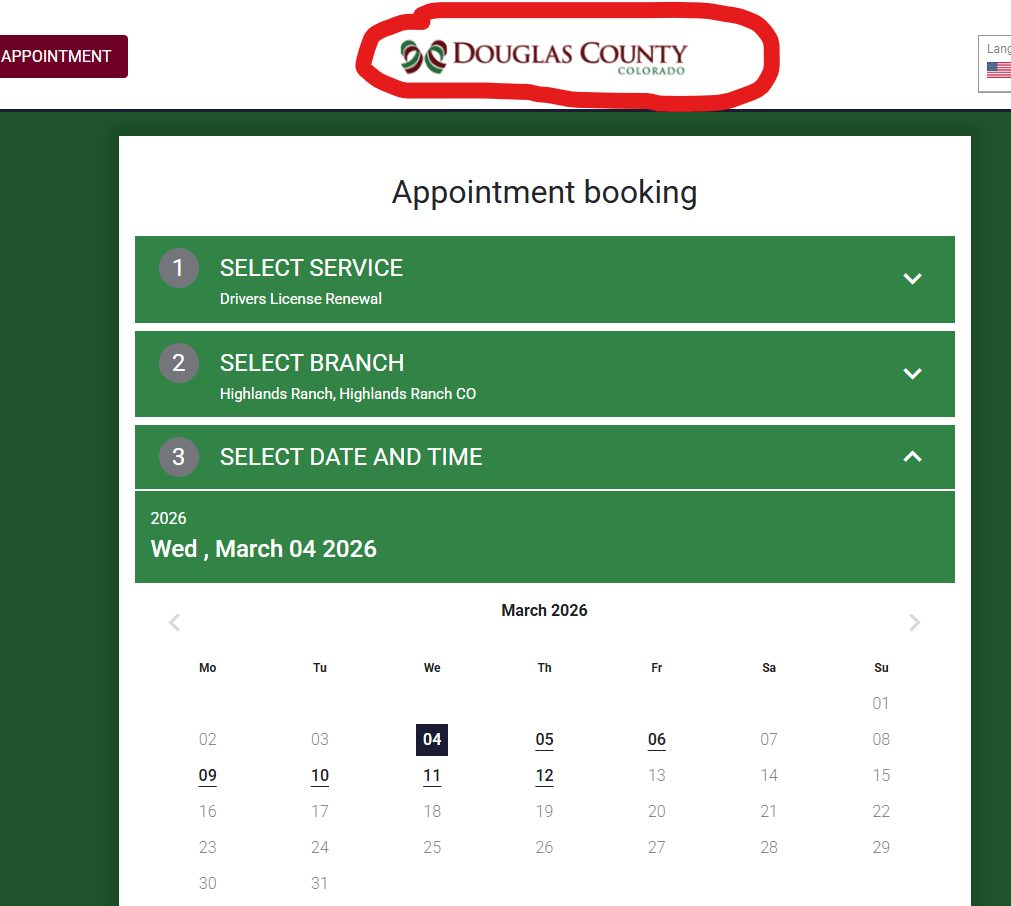 While it is true that Colorado counties do not issue driver's licenses (as that is a function of the state), many counties in our state have opted to serve their citizens by placing limited-service driver's license offices inside existing county DMV offices. Neighboring Douglas County has done this. Take note of the following two screenshots which were taken at the same time on February 26th. Residents of Centennial or Aurora have to use the Colorado State website to make an appointment to renew a license. The screenshots show the user would have had to wait a month for an appointment. Many people have complained that they had to wait six weeks. If a citizen of Douglas County set that same appointment through the Douglas County system, the wait was only three days.