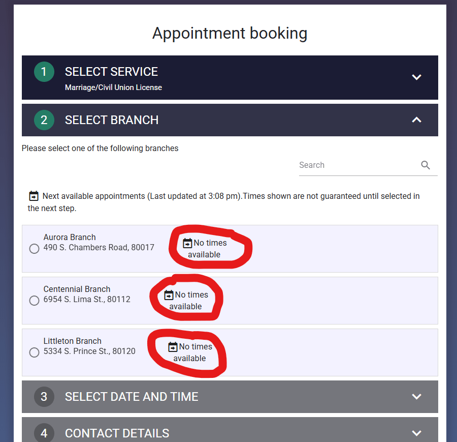 Getting a marriage license in Arapahoe County can be an especially frustrating situation. The following screenshot from the Clerk's website shows no available appointments. A call confirmed that this wasn't some online glitch. The appointment system only allows appointments to be scheduled for two weeks in the future. If a person wants to set an appointment, they must be one of the first people to hop online at the beginning of the next business day and hope someone else did not take one of the limited spots before they can make their own appointment.