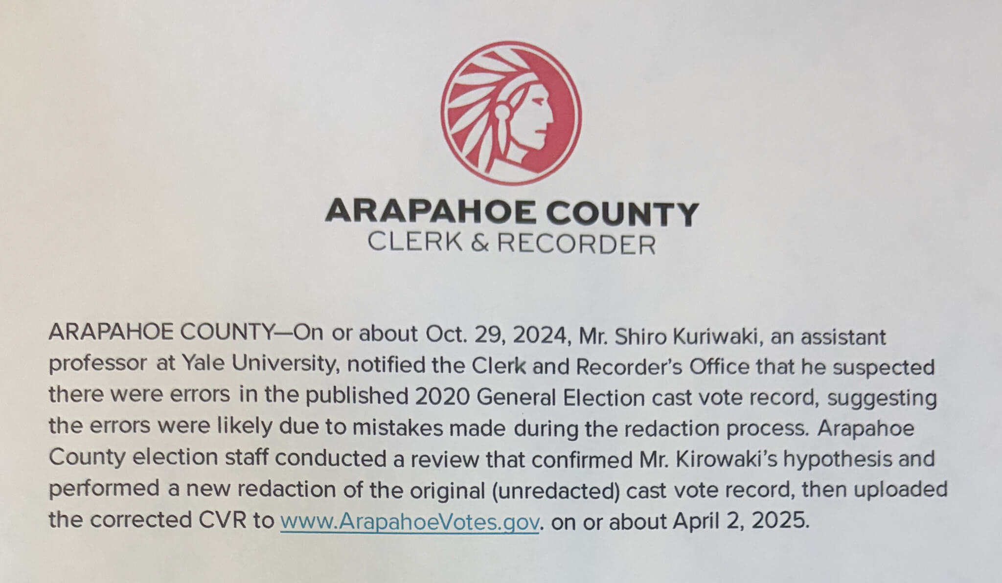 In late 2024, according to the county, Yale assistant professor Shiro Kuriwaki found a redaction problem in Arapahoe County's 2020 election. (Redaction affects precincts so small it might be possible to tell from the record who voted which way.) In early 2025, Lopez authorized the public version of the original CVR to be replaced with a new document, claiming this is not a change to election records because the non-public original CVR was unchanged. However, since the public is not allowed to see the original CVR, the public only has Lopez's word for it.